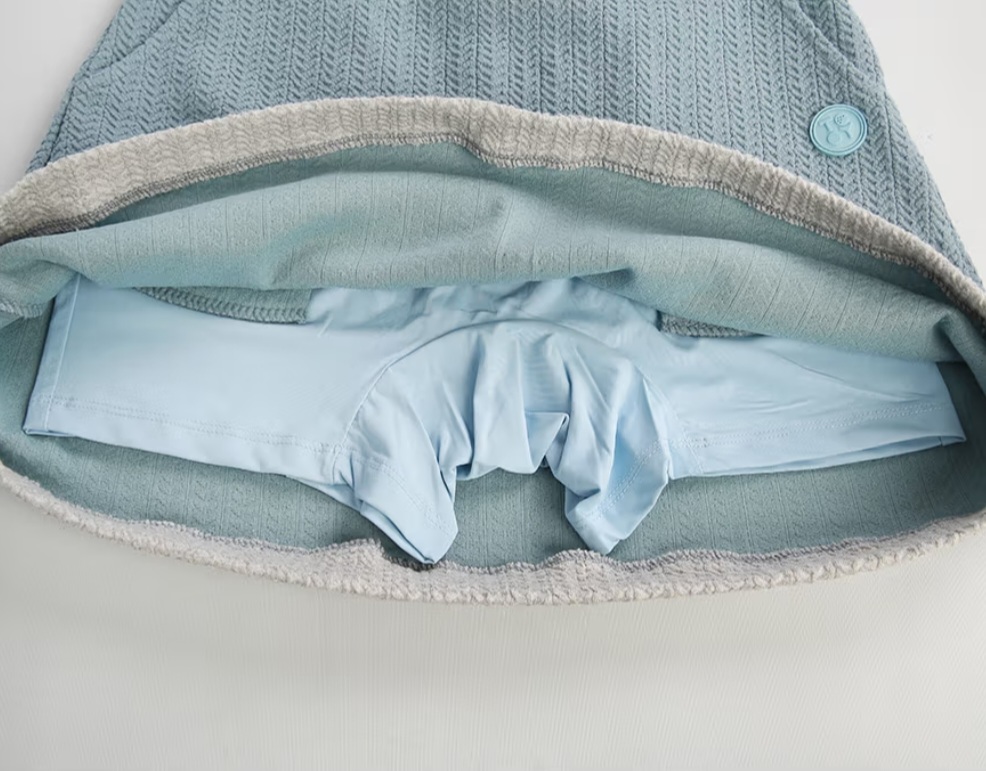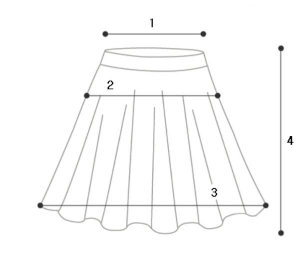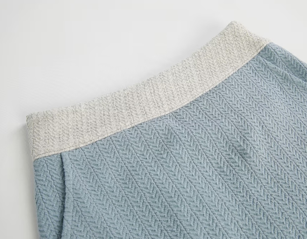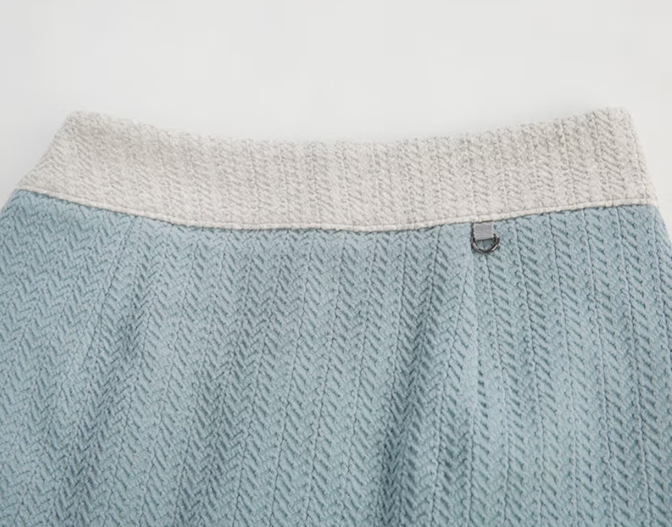 ・ボトムスは女性らしいAラインスカートにウエストバンドのホワイトリブド処理でフィット感を強調